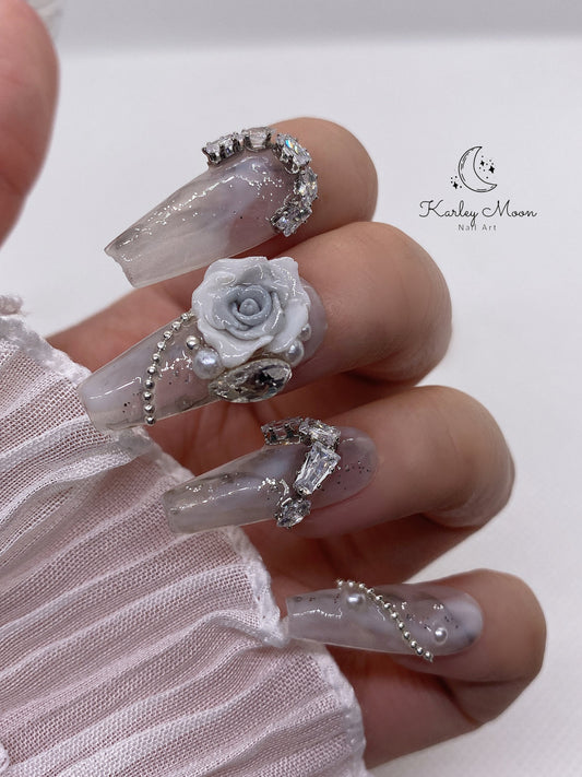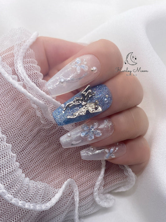 Ocean Blue 3D Butterfly Flower Glitter Press On Nails