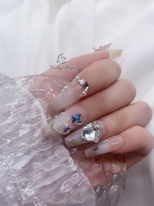 Elegant Nude Pink Butterfly Glitter Rhinestone Crystal Press On Nails