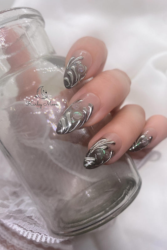 Y2K 3D Shimmering Silver Green Glitter Party Press On Nails