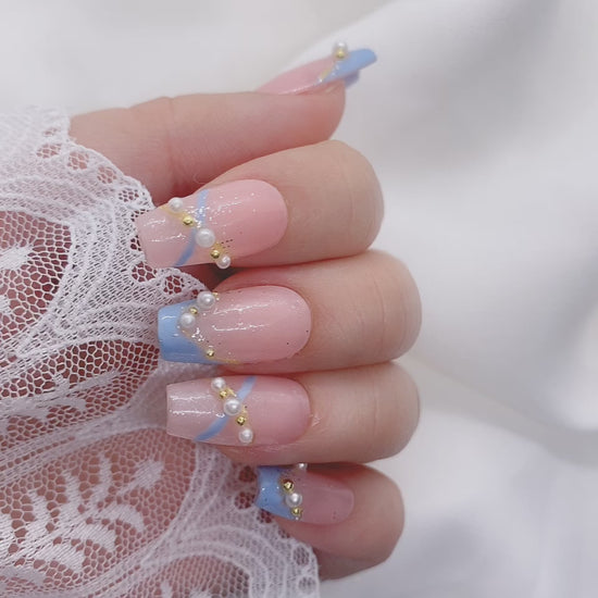 Casual Hand Painted Blue and Pink Classic Pearl Press On Nails