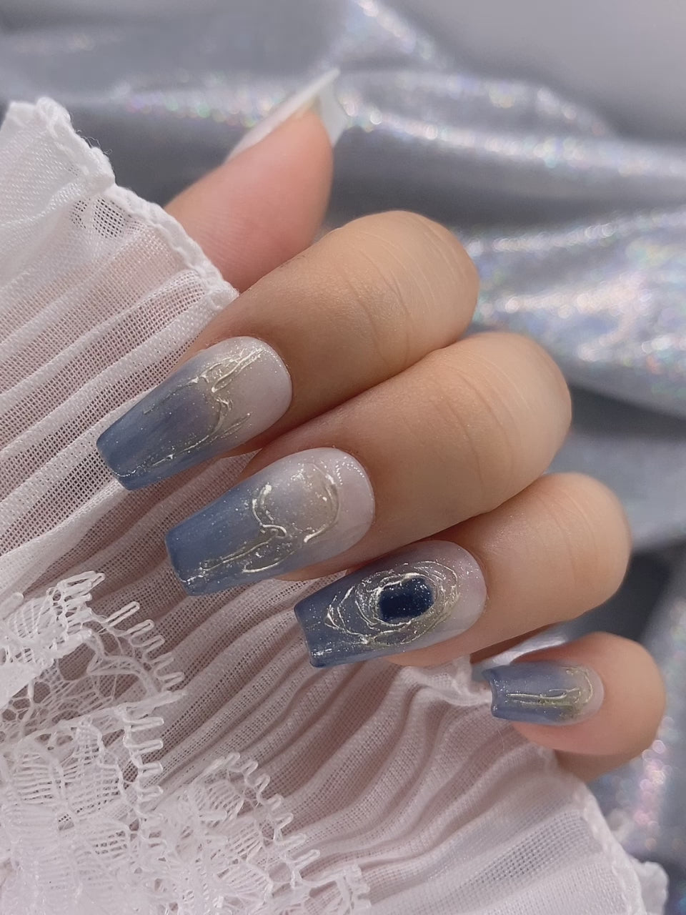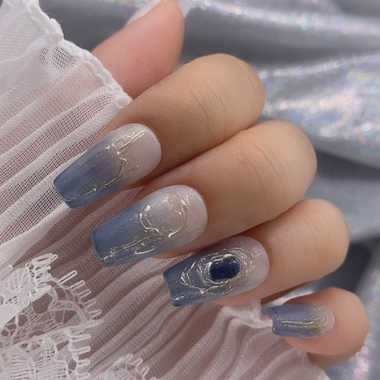 Summer Nails Watercolor Blue Galaxy Glitter Stone Press On Nails