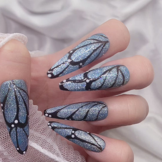 Elegant Fancy Blue Glitter Butterfly Wing Press On Nails