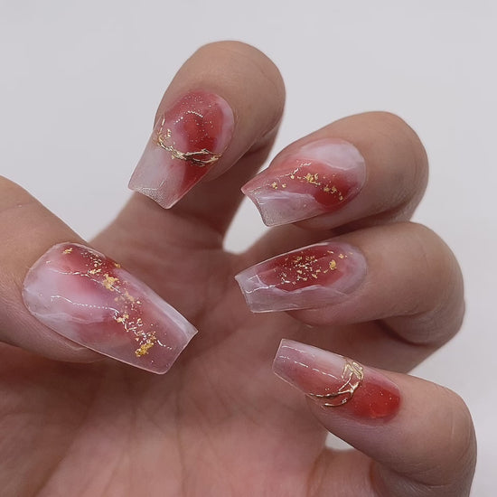 Elegant Watercolor Red Golden Glitter Press On Nails Watercolor Nails