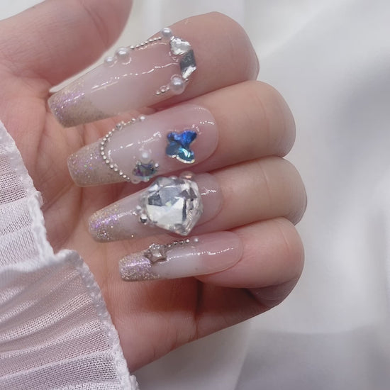 Elegant Nude Pink Butterfly Glitter Rhinestone Crystal Press On Nails