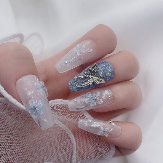 Ocean Blue 3D Butterfly Flower Glitter Press On Nails